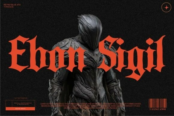 Ebon Sigil Font is a powerful blackletter typeface that embodies mystery, strength, and dark elegance. Inspired by medieval manuscripts, ancient sigils, and occult symbolism, this font captures the haunting beauty of gothic art. Its bold, angular strokes and dramatic contrast make it perfect for metal band logos, fantasy titles, horror posters, or any design that seeks a sense of mystic grandeur.