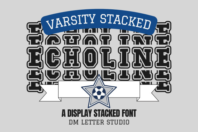 Echoline Varsity Stacked is a bold and layered version of the original Echoline Varsity font, designed for maximum impact and readability. Featuring stacked lettering with a sporty edge, this font captures the essence of team pride, school spirit, and vintage athletic aesthetics — all in a modern layout ideal for standout headlines and apparel.