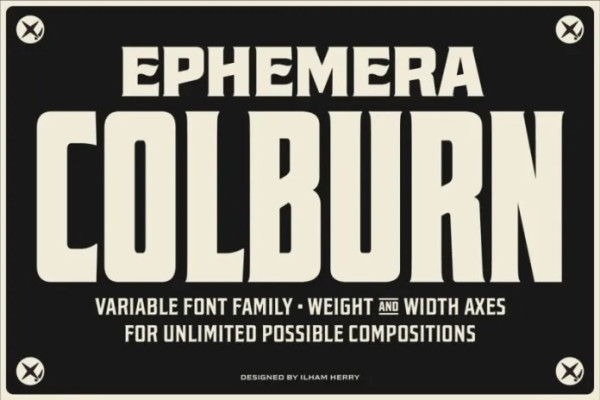Efco Colburn Font – Colburn is a squarish typeface inspired by lettering found on vintage tins, with an expansive range of styles, from compressed to extended, Colburn is a display typeface that captures the essence of nostalgia while offering modern versatility. The uniform square shapes provide a solid foundation, lending the font a sense of stability and strength.