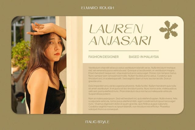 Elmaro Rough’s versatility allows it to shine across various design projects where a balance of elegance and texture is desired. From sophisticated logos to striking headlines, it delivers a sophisticated yet bold impression that captures attention and enhances visual appeal.