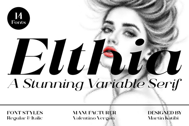 Elthia Font Family: A Stunning Variable Serif Font Family for the Modern Designer. Elevate your designs with Elthia, a captivating variable serif font family that seamlessly blends classic elegance with contemporary flair. Elthia stunning design makes it the perfect choice for graphic designers and advertising agencies seeking to create bold, trendsetting visuals. This versatile typeface boasts 6 weights in both regular and italic styles, offering great flexibility for your creative projects.