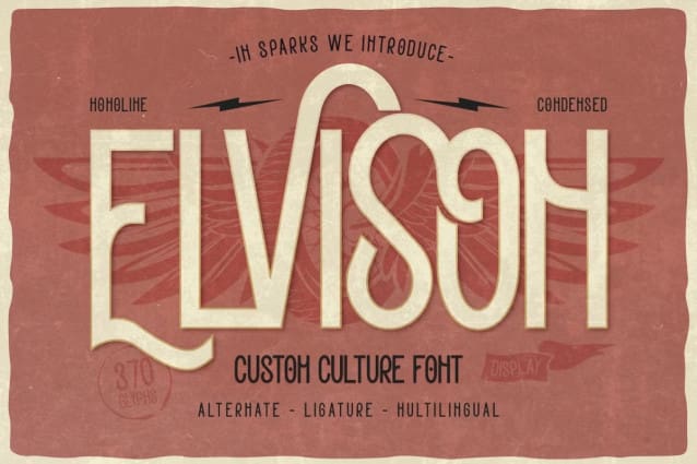 Elvison Font, a culture custom font inspired by the spirit of classic american design. Elvision is condensed monoline with unique ligatures that make sense of vintage, nostalgia, classic, custom culture, machine, art deco, grunge and retro. The multilingual support making it sutibale for international projects. This font ideal for branding, poster, social media, automotive, sports, barbershop, tattoo parlor, music cover album and many more.