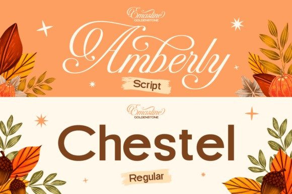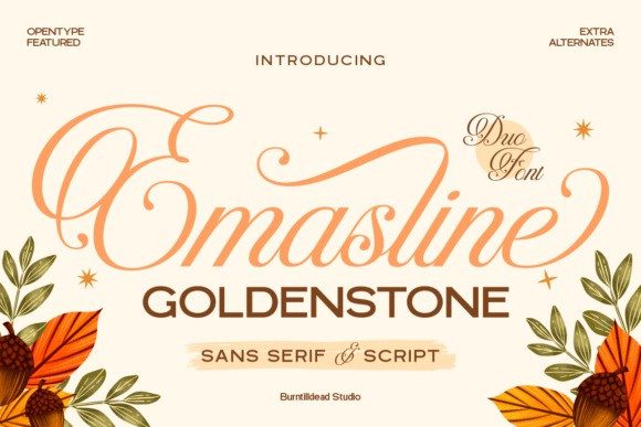 Emasline Goldenstone Font Duo, a duo font that feels like a warm cup of tea on a crisp autumn afternoon. This font combines a graceful script and a modern sans serif, making it perfect for cozy seasonal designs, wedding invitations, fall branding, or anything that needs that “golden hour” touch.