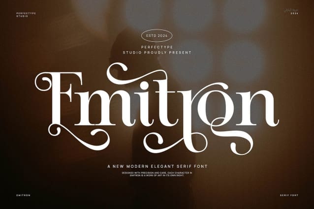 Emitron font is used only for demos (Demo license). If you want to use this font for commercial use please contact: https://creativemarket.com/Perfectype/280407632-Emitron-Elegant-Serif-Font?u=fontlot123