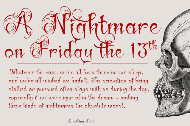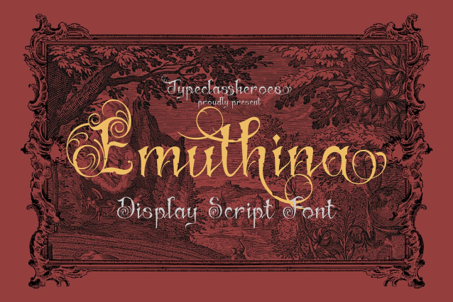 This font is used only for demos (Demo license). If you want to use this font for commercial use please contact: https://creativemarket.com/TypeClassHeroes/291808912-Emuthina-Decorative-Script