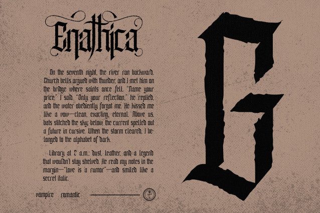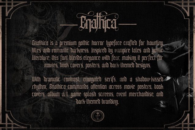 Enathica Font is a bold and haunting vampire horror font that evokes the eerie elegance of gothic romance and classic horror. Crafted with sharp blackletter-inspired strokes and ornamental swashes, it delivers a spine-chilling aesthetic that is both timeless and theatrical. This font offers uppercase, lowercase, ligatures, alternates, symbols, punctuation, and numerals—making it ideal for creative professionals who want to inject dramatic flair into their designs. Whether you’re a vampire-themed book cover, metal band logo, occult merchandise, or Halloween posters, Enathica is your perfect typeface for storytelling in darkness and desire.