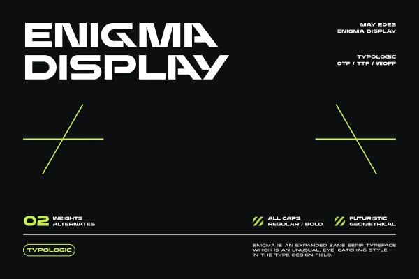 Enigma Font is an expanded sans serif typeface, which is an unusual, eye-catching style in the type design field. All letters have the same weight optically and create a consistent feel across varied uses. Alternate characters are available for those of you who want to create a unique type, making your identity stand out more.