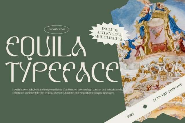 Equilla Display Font is a versatile, bold and unique serif font. Combination between high contrast and Brutalism style, Equilla has a unique style with stylistic, alternates, ligatures and supports multilingual languages.