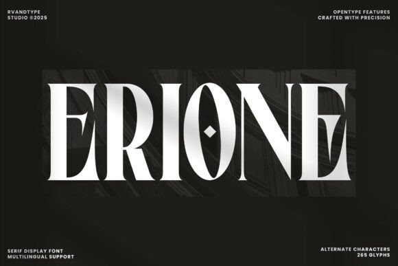 Erione Font on a design journey into the realm of Erione, a digitally-advanced serif font crafted to make a lasting impact to your audience. Its bold and assertive profile embodies an air of authority that confers a high-end flair to your designs. Anchored in sturdy letter structures, crisp detailing, and clearly distinguished stroke contrasts, Erione undeniably compels attention, ensuring your designs carve a unique place of their own. With the capability to bolster logos, branding narratives, headlines, posters, editorial, and packaging designs, it also performs exceptionally well on digital media, adding a strong aesthetic tone to your social media posts. Erione comes packed with a surplus of features to augment its usage and value – it flaunts a robust serif character, alternate character set, bilingual support, and a comprehensive set of uppercase & lowercase letters, figures, and symbols. This flexible and dynamic font serves as an optimal selection for fashioning a memorable logo and brand persona, forging arresting headlines and posters, curating engaging packaging, and enriching your fashion and beauty marketing. Moreover, it seamlessly aligns with the creation of visually gripping social media content that captivates and retains attention. Grace your design future with confidence with Erione.