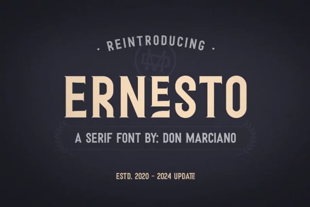 Ernesto Font is an everlasting serif font that evokes a vintage showmanship style. 2024 Update that includes new standard and discretional ligatures, with new available vowel alternates. I’ll appreciate your support if possible.