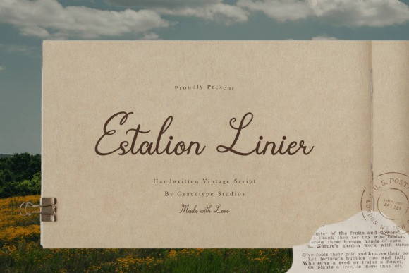 Estalion Linier Script Font a beautiful handwritten vintage script. This font features a relaxed, rhythmic flow with gentle loops and a consistent monoline weight that feels authentically “made with love.” It is an ideal companion for vintage-themed wedding invitations, rustic packaging, historical scrapbooking, and personal branding projects. With its warm, approachable personality, Estalion Linier brings a sense of timeless storytelling to any design.