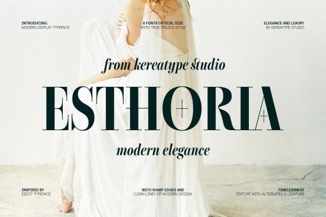 Esthoria Font Family is a high-contrast serif font family that merges timeless elegance with modern minimalism. Inspired by Didot and Bodoni, it comes optical choice in 6 sophisticated styles, each with a true italic option, making it perfect for headlines, logos, and editorial designs.