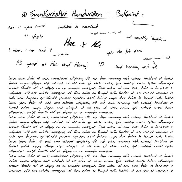 EvanKurtzArt Handwriting Font – This font is based on my own handwriting, with a focus on stylistic accuracy. It is not meant for copy where legibility is critical, and is really only intended for use as an ancillary element, as it will likely need adjusting.