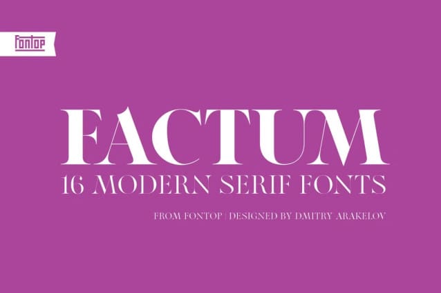 Factum Font Family, is a classical style serif typeface that sets the mood and evokes emotions before you read the text. It consists of 16 fonts. Interchanging thick and thin lines, especially in Medium and Bold styles, creates an elegant silhouette and a rhythm in title sheet, cover art or poster. Yet Light and Regular styles look great in large type as well as headlines. Another speciality of the font family is Stencil styles that help you play around your typography and logotypes.