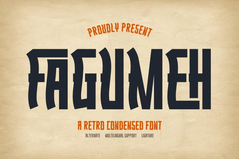 Fagumeh Display font! This retro condensed font boasts a unique and high form, making it perfect for a wide range of design themes. Its stylistic sets and alternate characters offer a playful and distinct touch, while its unique ligatures add an extra touch of character. Fagumeh is the perfect font for any project that needs a touch of vintage flair and versatility. Upgrade your designs today with Fagumeh font.