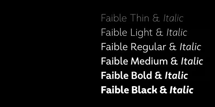 Faible Sans Serif Font Family is everybody’s darling. You cannot not like this good-natured humanist typeface. Sure, it’s a typeface for serious work—but all serious work is better when you put a smile on your face and a whistle on your lips.