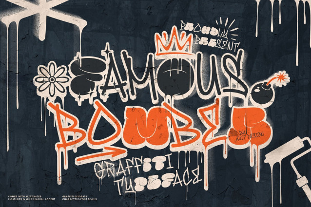 Crafted with meticulous attention to detail, “Famous Bomber” offers a unique blend of bold, graffiti-inspired letterforms and fluid, expressive script characters. The fusion of these two styles creates a visually striking aesthetic that captures the essence of urban artistry.