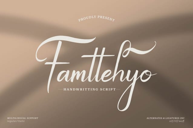 Famtehyo Script Font | Handwritten Script, from Gracetypestudio, suitable for any projects such as: logos, branding projects, homeware designs, product packaging, mugs, quotes, posters, shopping bags, t-shirts, book covers, name card, invitation cards, greeting cards, label, photography, watermark, special events, and all your other lovely projects that need a beautiful script taste.