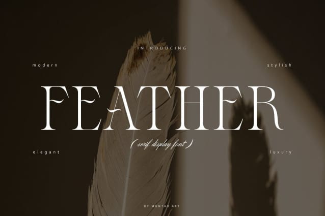 Feather Font include uppercase letters, numerals, a large range of punctuation. Serif font with modern style. Created for poster, web design, branding, illustrations, badges and some other works.