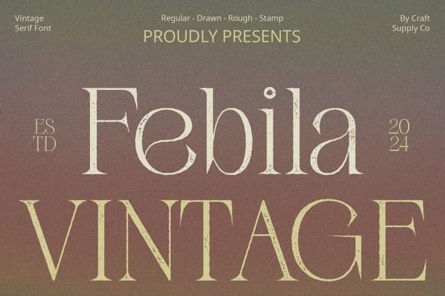 Febila Vintage Font: Embracing Vintage Elegance. High Contrast Serif Design Febila Vintage presents a striking serif display font characterized by high contrast and thin strokes. Its bold yet delicate appearance commands attention and adds sophistication to any project.