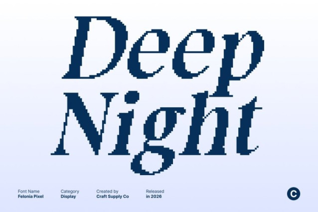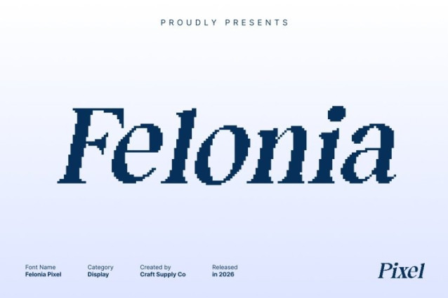 Felonia Pixel Font This is an elegant serif font that blends classic sophistication with retro charm, enhanced by a distinctive pixel style. This fusion creates a timeless yet nostalgic look inspired by early digital screens and old-technology aesthetics, making the font instantly eye-catching and memorable.