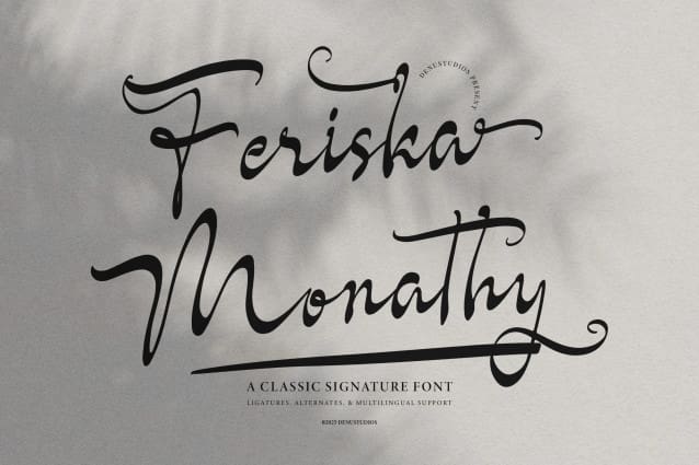 Feriska Monathy | Classic Signature Font, from Denustudios, suitable for any projects such as: logos, branding projects, homeware designs, product packaging, mugs, quotes, posters, shopping bags, t-shirts, book covers, name card, invitation cards, greeting cards, label, photography, watermark, special events, and all your other lovely projects that need a Classic Signature Font taste.