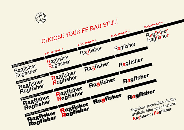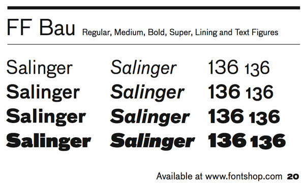 In spite of – or perhaps because of – Helvetica’s reputation for cold, calculated perfection, it has been the world’s most popular Roman typeface for over four decades. Drawn by Max Medinger and introduced under the name Neue Haas Grotesk in 1957, its roots lie in much quirkier and personable material. Its earliest direct ancestor, known simply as Grotesk, was first introduced by the Schelter & Giesecke foundry in Leipzig around 1880. The Bauhaus, in nearby Dessau, chose this face as the main workhorse for their printing shop, and used it for the vast majority of their classic experiments in asymmetrical typography. In 1999 Erik Spiekermann asked type designer Christian Schwartz to consider drawing a revival of S&G’s Grotesk, updating the family for contemporary typographic needs without rationalizing away the spirit and warmth of the original. The Regular, Medium, and Bold are drawn directly from S&G sources, and the Super was added for situations where subtlety would be inappropriate. The family is released in 2002 under the name FF Bau, in homage to the most noted users of the original.