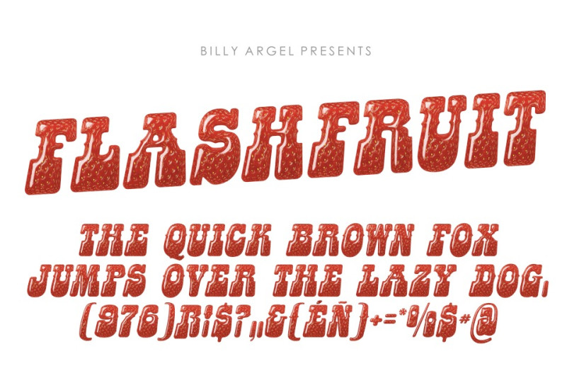 Flashfruit Display Font, this file allows incorporation in PDF and the standard license is for corporate and personal identities, watermarks, logos, merchandise, promotional items, monetization of videos and YouTube channels, collections of clothing, t-shirts, portfolios, crafts, layouts, CDs, labels, etc …