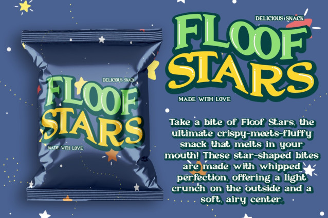 Floofy Bubble – Bubble Font, a playful and charming display font that brings joy and creativity to your designs. With its soft, rounded serif letters and bubbly shapes, this font exudes a fun, cheerful, and whimsical vibe. The mix of yellow and green hues enhances its lively appearance, making it perfect for projects that need a friendly and approachable touch. The background features a deep blue sky adorned with scattered stars and cute doodles, reinforcing the font’s dreamy and imaginative aesthetic. Whether you’re designing for kids, branding a fun business, or creating eye-catching packaging, Floofy Bubble delivers a unique and memorable look.