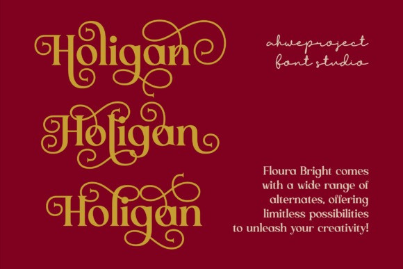 Floura Bright Font is a curly and stylish serif font that combines elegance and creativity in one design. Its swirly details and bold structure make it perfect for projects that require a touch of sophistication and charm. Whether you’re working on branding, invitations, or editorial designs, Floura Bright adds a unique personality to your work. Ideal for luxury themes, feminine designs, and anything that calls for an ornate yet legible typeface.