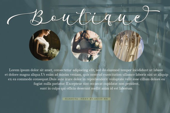 Garnita Script Font by Arief HK 14,689 downloads Found in: Calligraphy Fonts, Script Fonts Garnita Script Font