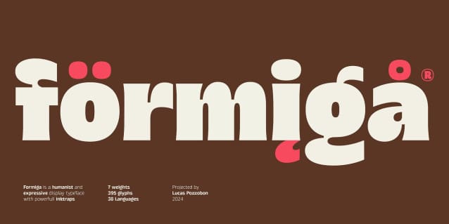 Formiga Font Family is a humanist and expressive display typeface, perfect for impactful headlines in modern and contemporary design contexts. It is also ideal for packaging with a fresh, bold, and powerful style. The typeface family offers seven weights, from light to black, supports 38 languages, and includes OpenType features to improve the legibility of specific characters.