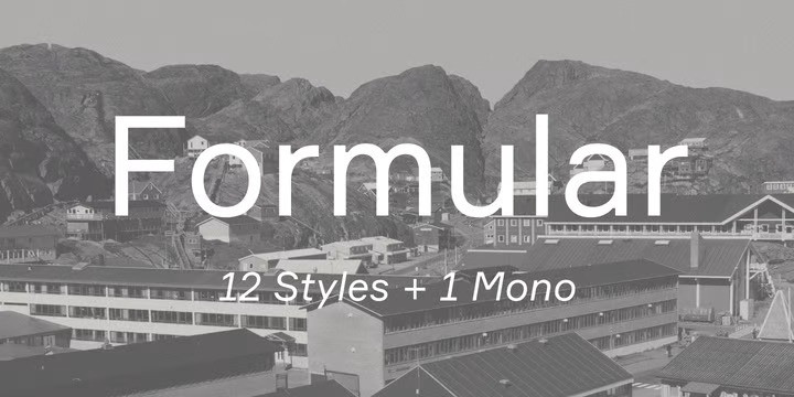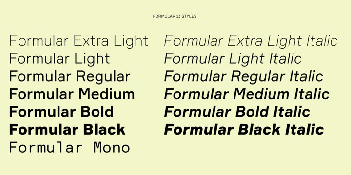 Formular Sans Serif Font Family is a hip Swiss sans serif of the new generation. Inspired by the utilitarian 19th-century grotesques, its precision and and versatility are combined with a slightly eccentric character. A child of its time, it scoffs at the ideology of ‟ideal” forms, yet it is every bit as functional for all its idiosyncrasies, as any self-respecting Swiss sans. Formular comes in five weights with corresponding italics and a monospace companion to the regular weight. Each weight includes special extra-light punctuation, lining tabular and old style figures, case-sensitive punctuation, and stylistic alternates.