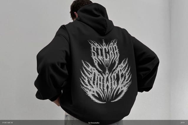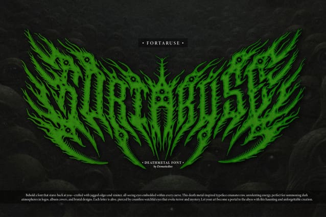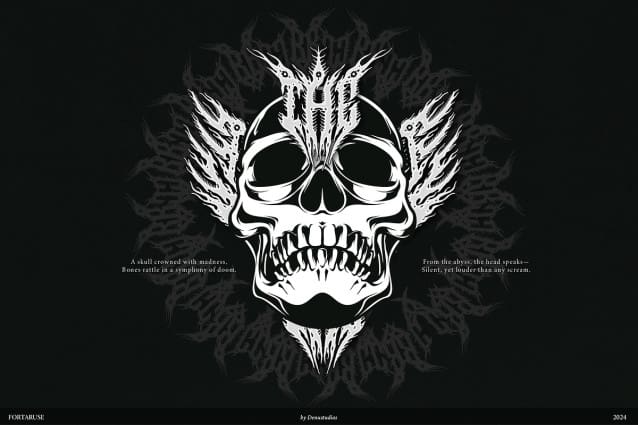 Fortaruse Death Metal Font, from Denustudios, suitable for any projects such as: logos, branding projects, homeware designs, product packaging, mugs, quotes, posters, shopping bags, t-shirts, book covers, name card, invitation cards, greeting cards, label, photography, watermark, special events, and all your other lovely projects that need a Death Metal Font taste.