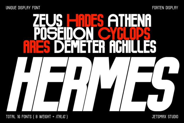 Forten Display Font Family is a distinctive and modern condensed typeface designed to make a strong visual impact. Featuring a complete set of 16 fonts — 8 weights from Thin to ExtraBold, each with a matching italic — this font family offers versatile expression and dynamic contrast for any design need.