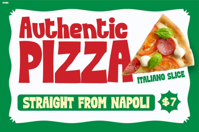 FOTUMI was created with inspiration from Italian eateries, kid-friendly branding, and joyful food visuals. Its letters carry a soft handcrafted look that pairs well with pizza illustrations, pasta graphics, or any colorful food imagery. Furthermore, the curves and bold strokes create a natural flow, making the font highly readable at any size.