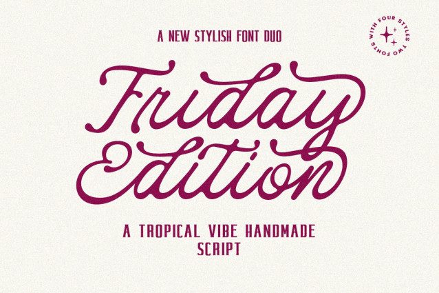 Friday Edition Font Duo, a sweet and gentle font duo! With a bold, rounded serif font and a flowing handwritten script, this playful combination strikes the right balance between bold and friendly. Perfect for product labels, greeting cards, social media posts, branding projects, logo designs, packaging, quotes, and more.
