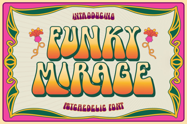 Funky Mirage Font is a psychedelic serif font that blends vintage groove with bold, mind-bending character. Featuring wavy details, fluid curves, and expressive serifs, this font captures the free-spirited energy of retro psychedelic design. Perfect for music posters, album covers, festival branding, trippy artwork, and statement headlines, Funky Mirage brings a vibrant and nostalgic vibe to any creative project.