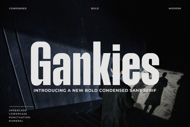 This font is used only for demos (Demo license). If you want to use this font for commercial use please contact: https://creativemarket.com/typelogue/279563717-Gankies-Bold-Condensed-Sans-Serif?u=fontlot123
