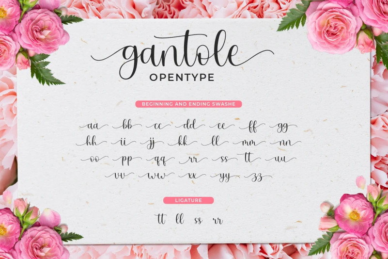 Gantole Font is a modern calligraphic font, with characters dancing along the baseline and an elegant touch. With nearly 420 glyphs. Features open types with alternative styles, bindings, and multiple language support. Can be used for various purposes such as logos, wedding invitations, headings, t-shirts, letterheads, signage, labels, news, posters, badges etc. To enable the OpenType Stylistic alternative, you need a program that supports OpenType features such as Adobe Illustrator CS, Adobe Indesign & CorelDraw X6-X7, Microsoft Word 2010 or a later version. Gantole is encoded with PUA Unicode, which allows full access to all additional characters without having to design special software. Mac users can use Font Book , and Windows users can use Character Map to view and copy any additional characters to paste into your favorite text editor/app.