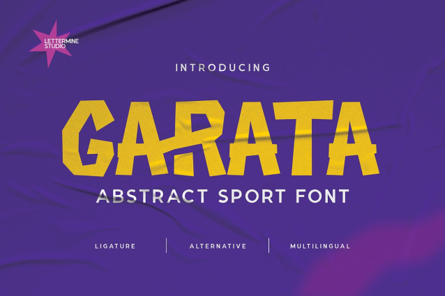 Garata Font is a bold, abstract display font built for energy and impact. Its unique angled forms and chopped character shapes give off a powerful, athletic vibe — making it perfect for sports branding, esports teams, poster headlines, apparel design, and action-themed media.