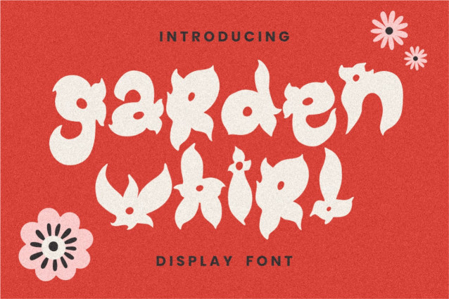 Garden Whirl Font, an exquisite display font that blossoms with unique floral shapes. Inspired by the whimsical and organic beauty of nature, each character intricately weaves floral motifs into its curves and edges, creating an artistic and playful aesthetic. This font stands out due to its distinctive design, incorporating petals and blooms directly into the typography. The irregular, yet harmonious forms of Garden Whirl make it a captivating choice for adding a distinctive flair to your visual projects, especially when aiming for a playful or vintage-inspired look.