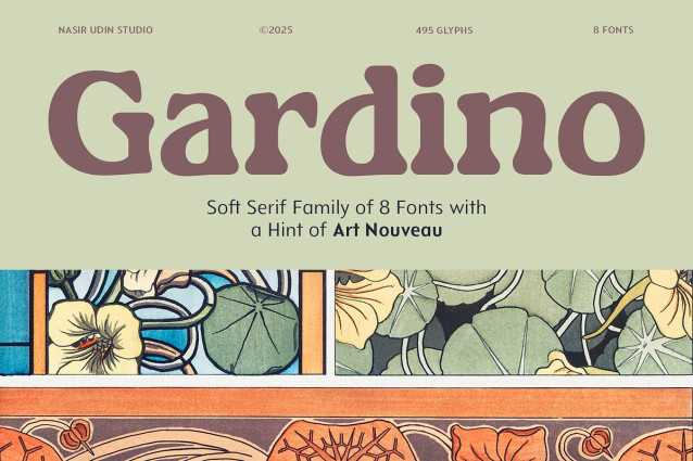 Gardino Font is a serif family of eight fonts inspired by hand-letter works and typefaces from the Art Nouveau era, especially Radium (by Ludwig & Mayer, 1904), Arnold Bocklin (by Otto Weisert, 1904) & Hobo (by ATF, 1910).