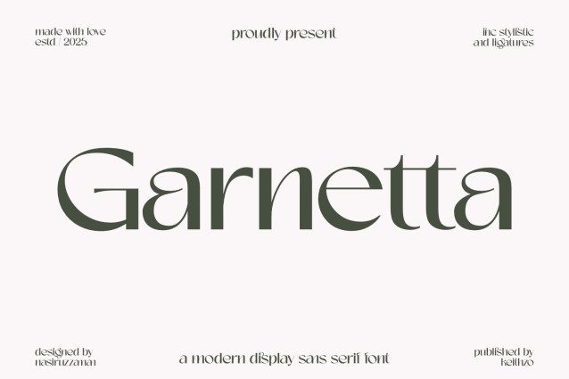 Garnetta Font is a carefully crafted modern display sans serif font, offering an aesthetic that is both luxurious and contemporary. Designed with precision, this typeface features an exceptional balance of strong, upright strokes and delicate, sweeping curves, giving it a distinguished and highly memorable appearance.