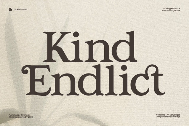 GC Kind Endlict Font — Elegant Retro Serif is a distinctive serif typeface crafted with a blend of vintage charm and modern refinement. With its unique curves, decorative details, and bold presence, it brings a timeless character that works beautifully across both digital and print media. Designed to embody elegance with a touch of retro artistry, it’s perfect for branding, editorial layouts, packaging, invitations, and striking visual identities.