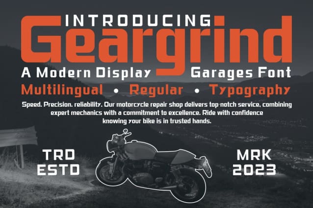 Geargrind Font – Modern Font is a bold and authentic display font. The font is suitable for any branding project such as logo, template design, product and many more. It looks outstanding in a wide range of contexts
