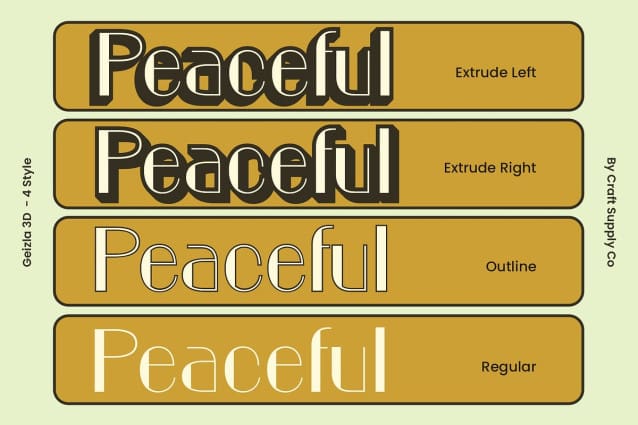 Enhanced with a Dynamic 3D Effect The addition of a striking 3D effect brings Geizla 3D to life, adding depth and visual intrigue to your designs. This dimensional flair ensures a captivating presence, elevating your text with a luxurious and dynamic touch. Whether used for headlines, branding, or promotional materials, the 3D effect enhances its visual appeal and sets it apart.