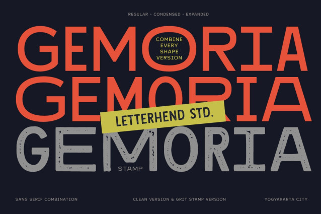 Gemoria Font is a modern sans serif font family that gives you serious flexibility. With three styles—Regular, Condensed, and Expanded—plus clean and gritty stamp versions, Gemoria lets you mix and match widths and textures for powerful, punchy designs. It’s built for branding, posters, headlines, packaging, and anything that needs a strong visual presence.