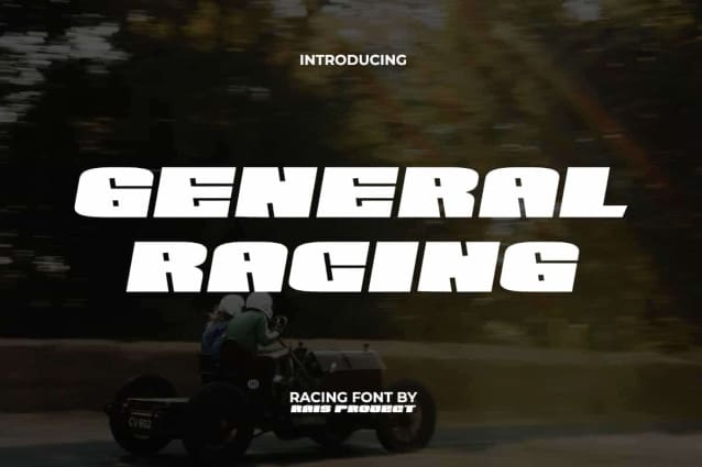 General Racing Font is a modern a bold trendy racing and stylish racing display font, by RaisProject. Despite being bold, display this font is still easy to read and can immediately catch the attention of anyone who sees it. It will be good for label, poster, invitation, signage, cover, menu, custom design, brand image, product packaging, quotes, stationery, web, and more!