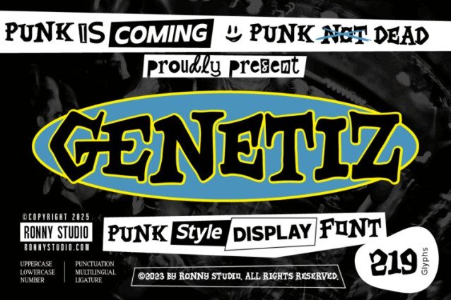 Inspired by gig posters, DIY cassette covers, band stickers, and early 2000s street-punk visuals, GENETIZ is the perfect choice for creating noisy, bold, and anti-mainstream artwork. Whether you’re designing merch, streetwear graphics, or edgy visual projects, this font will instantly elevate your work with unmistakable punk attitude
